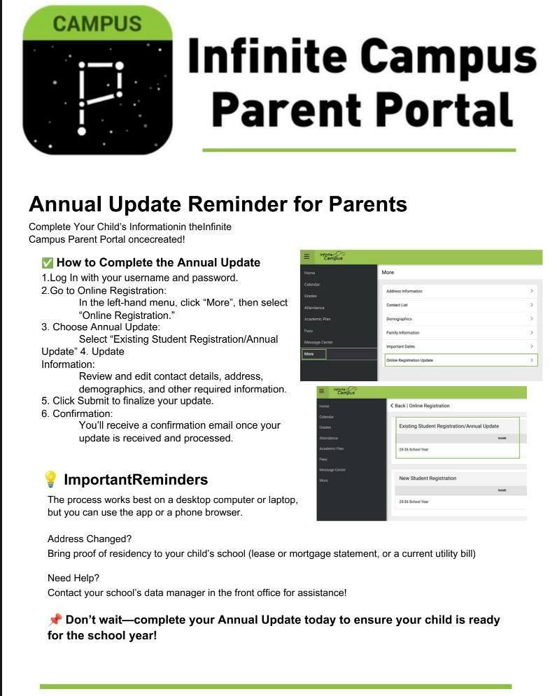 Use the steps in the graphic below to access the Infinite Campus Parent Portal and complete your beginning-of-year forms: https://tinyurl.com/RCSICParentPortal